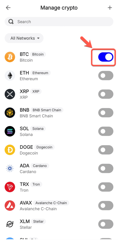 2. Search for “Bitcoin” (BTC) and toggle it on.