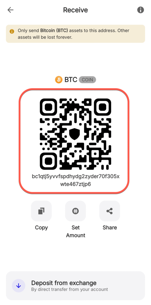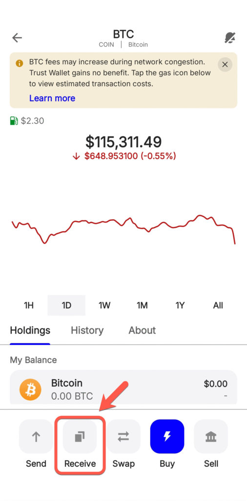 2. Tap “Receive” on the Bitcoin wallet screen.