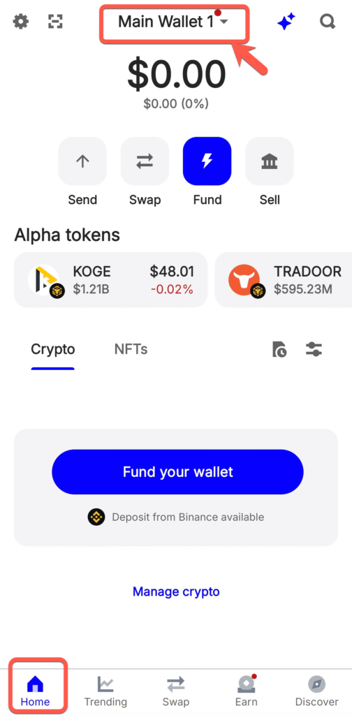 5. In Home Screen, the Wallet displays. You can select the Wallet in the drop down list to view each.